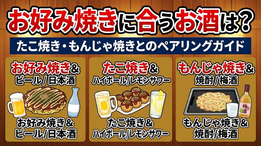 この記事では、お好み焼き・たこ焼き・もんじゃに合うお酒の考え方を解説しました。